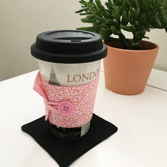 Handmade Fabric Coffee Cozy - Reusable Coffee Cup Sleeve, Pink Floral, Beverage