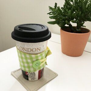 Handmade Fabric Coffee Cozy, Reusable Coffee Cup Sleeve, Yellow Green Gingham