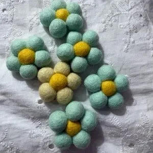 Set of handmade felt flower magnets in pastel colors. Features soft blue and yellow hues.
