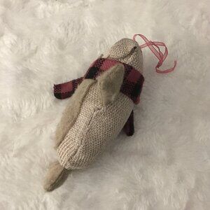 Good preowned condition hand felted and burlap Pig ornament in tan wearing a red and black tartan scarf, with black beads for eyes and a red ribbon for hanging.