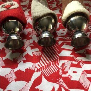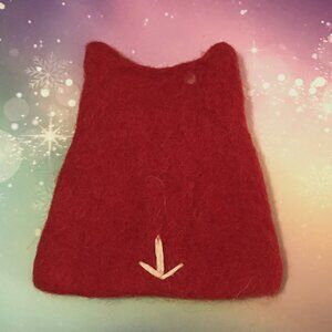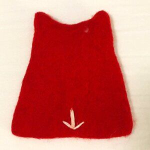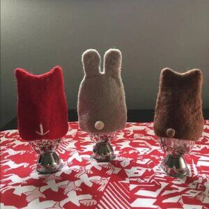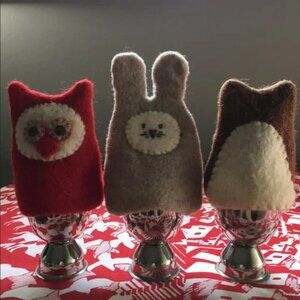 Excellent preowned condition hand felted Owl egg cozy in red and white with hand-stitching. Includes metal egg cup.