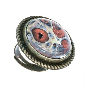 Unique handmade fluid art ring featuring a bold copper & silver abstract design. Set in a brass-tone adjustable band with rope-style edging. One-of-a-kind statement piece that fits most sizes!