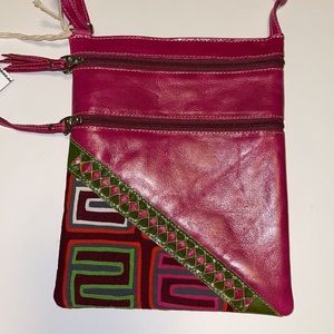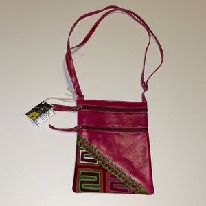 New with tags handmade fuchsia leather crossbody bag with multiple zippered pockets from Colombia.