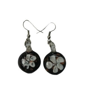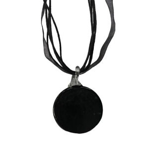 Glass pendant features a white flower, coppery flecks in the background and a black coloured glass backing. Necklace is made with strands of soft, thin black cord and sheer ribbon. Lobster claw clasp, adjustable chain.