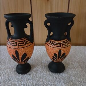 Elegant Greek style decorative set featuring two vases and a plate. Black and orange design with intricate patterns.
