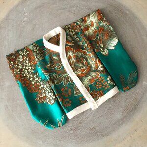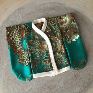 Good condition handmade silk jacquard kimono for dolls, made from silky embroidered fabric in emerald green, light gold and orangey brown with a white trim. It's a bit stiff the fabric and does not drape loosely. No obi included, but I can provide material for one. For everyone and anyone.