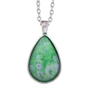 Handmade green fluid art pendant with a teardrop design set in a silver-tone bezel. Unique abstract pattern sealed under glass, giving a stone-like effect. Comes on a matching chain. Perfect gift or statement accessory.