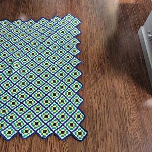 Handmade Green Yellow Navy Geometric Diamond Pattern Crocheted Blanket Crafted