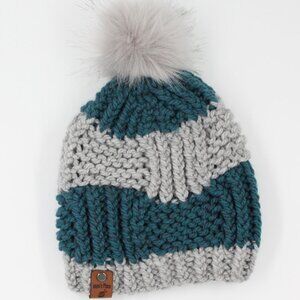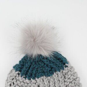 Handmade Hand Knit Blue Box Stitch Knit Hat for Kids Removable Pompom 6/10 y
