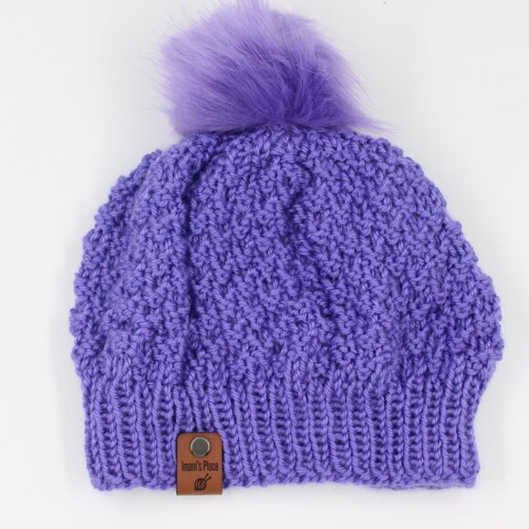 Handmade Hand Knit Purple Double Moss Stitch Beanie Hat with Faux Fur Pom Pom
