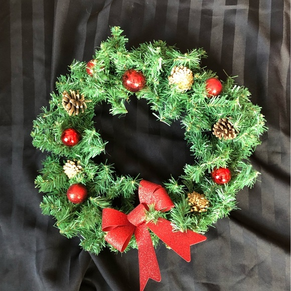 Vintage wreath purchased second hand (looking very sad) and revamped by myself. The pine cones and bow were on there I just swapped out the ornaments for more outdoor friendly versions. A pipe cleaner has been added to allow this to hang from a wreath hanger or nail but it can be easily removed should you so choose.