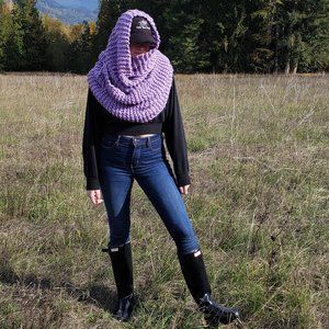 Hand knit infinity scarf in lilac with silver accents. Extra wide stitch for cozy coverage and hood option.