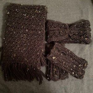 Handmade Knitted Scarf, Headband, Hand Warmers - Black speckled 3 piece set