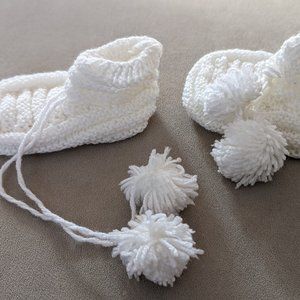 Pair of crisp white handmade knitted baby booties with pom poms.