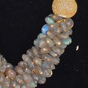 This Magnificent Labradorite Necklace is an example of Sharon's custom work. All of the beads and stones are genuine Labradorite. The Labradorite has an opalescent appearance. Note that each of the Labradorite beads in the center bundle is attached by hand using gold plated wire. Sharon's jewelry is created using genuine gemstones, pearls, sterling and gold filed or plated wire. Coming soon to our closet will be original pieces for sale by Sharon. Keep an eye out!