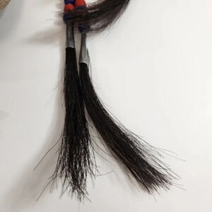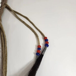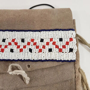 Handmade real Leather Beaded Purse Handbag. End tassels are real hair, possibly horse hair. Although the style is similar to some First Nations work the maker was actually European. Very nice condition other than a couple very small 1/8" marks on the bottom of the bag, shown in pics. It has a wood dowel inside to give it structure, and there is a small strap attached to that although it is really meant to be held in the hand. See pics for approximate measurements.