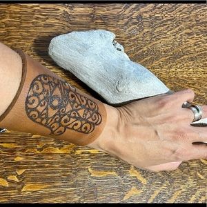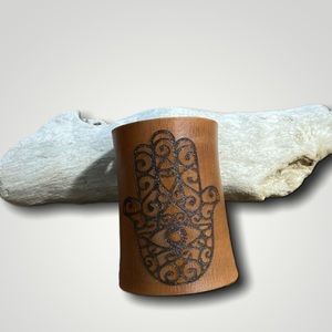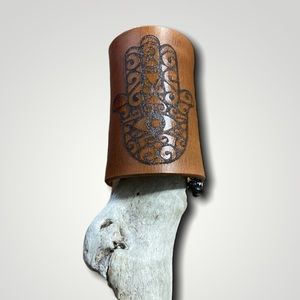 Absolutely stunning & unique leather cuff. Made of thick cowhide leather with a laser etched Hamza print. Slide on style with lace up cord with glass beads. Can be worn high or low on the arm. Completely handmade and one of a kind.