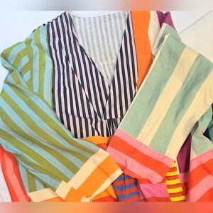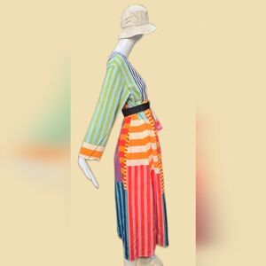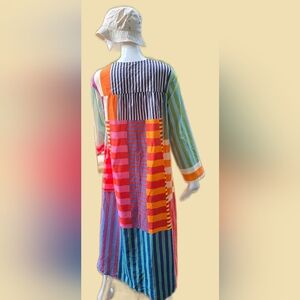 Bright and colourful handmade cotton dress. pull on V=Neck with deep side pockets. well constructed.