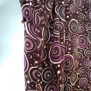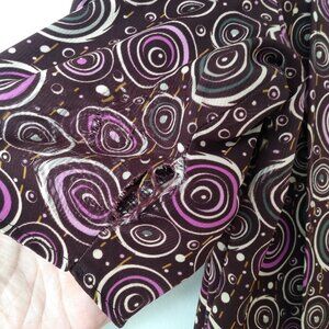 Brown with purple, green and yellow abstract geometric designs.