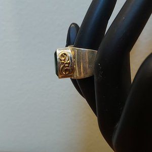 Ring has been resized to about a 3-1/2 to 4 but can be enlarged. Features a unique filigree pattern placed along side a cylindrical tube with a brilliant oval cut green glass accent. The actual length of ring is 5/8" approx.