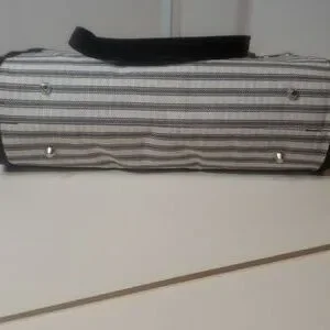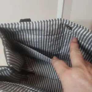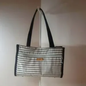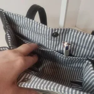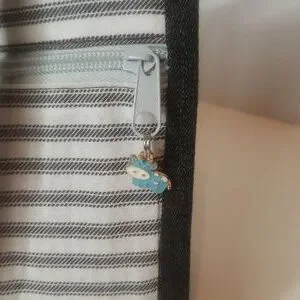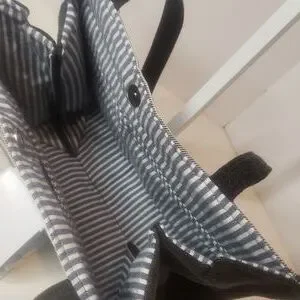 Handmade with cotton and black recycled denim jeans. 2 zipper pockets on the outside, and 2 slip pockets on the interior, one is devided. Single snap closure. Height is 15", 38cm. And as always cow charm.
