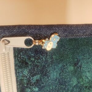 Handmade with cotton and recycled denim jeans. 2 zipper pockets on the exterior, and 2 slip pockets on the interior, one devided. Single snap closure, and silver feet. Height 15", 38cm. And as always cow charm.