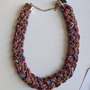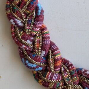 Handmade Multi Coloured printed fabric and gold minichairn statement Necklace, purchased many years ago from an Artisan at a Afro-Canadian Pop-up market, unfortunately I cannot recall their name to give proper credit.