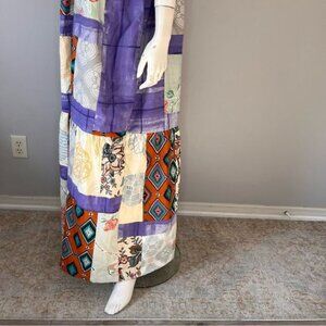 The dress features a meticulously crafted patchwork design, created by skilled hands. This unique, artisanal touch ensures that each dress is a one-of-a-kind masterpiece, reflecting careful attention to detail and individuality.