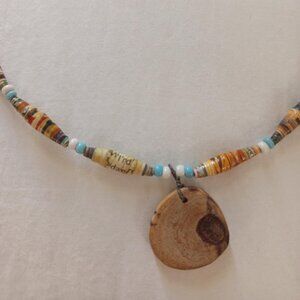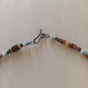 The beads are made of paper from magazines rolled on toothpicks and coated.