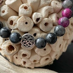 This elegant bracelet features a stunning combination of pink and gray beads, complemented by a silver accent. Perfect for adding a touch of sophistication to any outfit.