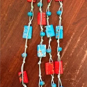 Beautiful blue and coral/reddish beads. When not looped it is 30” long