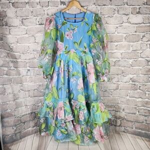 The large floral print has a beautiful iridescent shimmer. Paired with the sheer peasant style sleeve and the bottom layers of ruffles, this dress is the perfect summer piece!