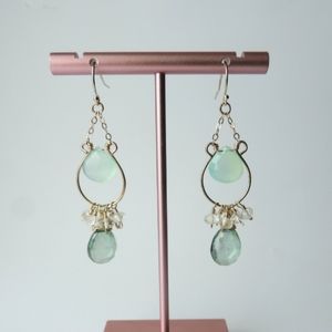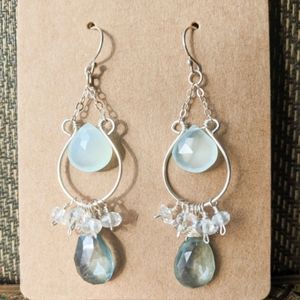 Materials include: crystal quartz rondelles, chalcedony drops, .925 sterling silver findings and wire