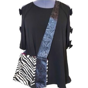This unique crossbody bag features a zebra print and a stylish silk tie strap. Handcrafted for quality and individuality, perfect for adding a touch of flair to any outfit.