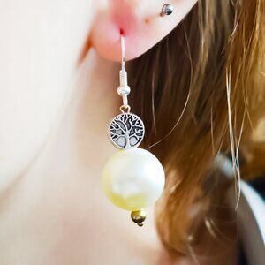 A pair of handmade, lightweight faux pearl dangle earrings with little decorative silver Tree of Life beads.