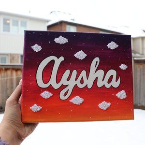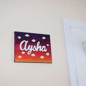 Handmade Personalized Name Canvas with sunset and embroidered cloud background. Personalized and custom name.