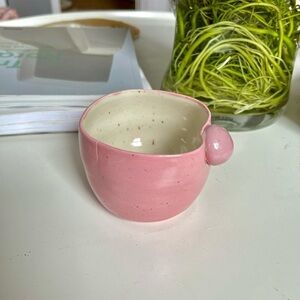 Handmade porcelaine bowl in light pink with a lilac knob. Could be used to drink out of or as a bowl. Has a tiny crack in the ceramic which happened during the baking process.