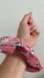 Adorable pink scrunchie with playful white and black cats doing silly yoga poses. Perfect for adding a fun touch to any hairstyle.