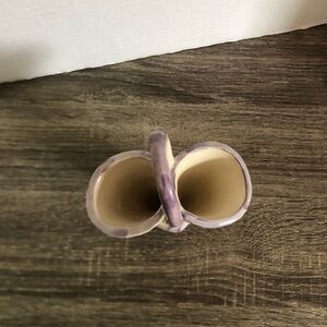 Enhance your home decor with this elegant ceramic vase. Featuring a beautiful purple and cream design, it's perfect for adding a touch of sophistication to any room. Adorable bud vase that has two separate vases in one. Handmade pottery. Seems to be dated 03 on the bottom.