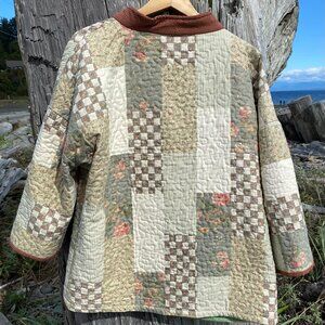 I made this jacket by repurposing a cotton quilted bedspread (see photo 5) It is a mock patchwork pattern in a faded sage green and vanilla colour scheme. The body is lined with lightweight India-printed cotton: the bands are made from a quilter heirloom cotton check. 2 front patch pockets (photo taken at sundown so true color is as per other pics) Leather and corded toggle button closure. The jacket is very soft and lightweight. Can be machine-washed in cold water, fluffed in a dryer and hung to finish drying.