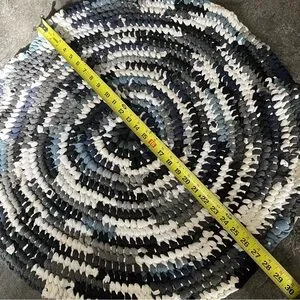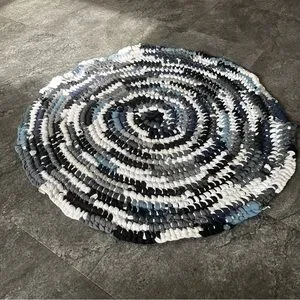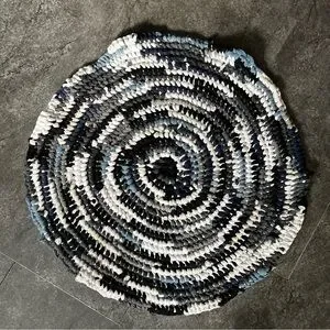 Handmade from old T-shirts, keeping them out of a landfill and giving them a second life. Great for in front of your sink or as a bath mat. Fantastic neutral colours, black, white, greys and blues! Easily washed on a normal washer setting, and lay flat to dry, may need to be reshaped after washing.