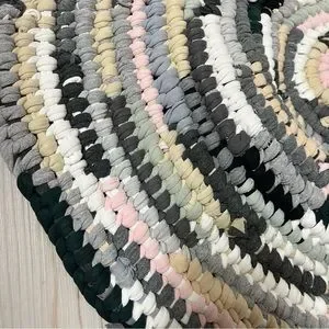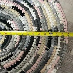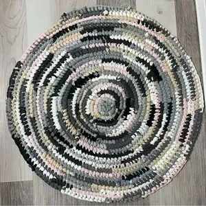 Handmade from old T-shirts, keeping them out of a landfill and giving them a second life. Great for in front of your sink or as a bath mat. Great pattern and colours, multi-coloured but neutral! Easily washed on a normal washer setting, and lay flat to dry, may need to be reshaped after washing.