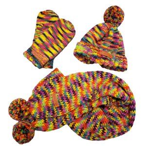 Rainbow colored Handmade with love by me. Hat and mittens are knit and the scarf is loom knit. Made of 100% acrylic yarn. Hat is unisex and can be worn as a slouchy or beanie and is one size. Mittens are a ladies Medium. Scarf is approximately 7 feet long from pom to pom and 4 1/2 inches wide. Items are new without tags.