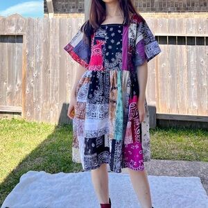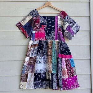 This one-of-a-kind dress is made entirely from brand-new 100% cotton bandana scraps, creating a vibrant patchwork design that’s both stylish and sustainable. Fully handmade with a reversible design, it offers versatile wear and a relaxed, pull-on fit. The dress is unlined and finished with a full serger stitch for durability.