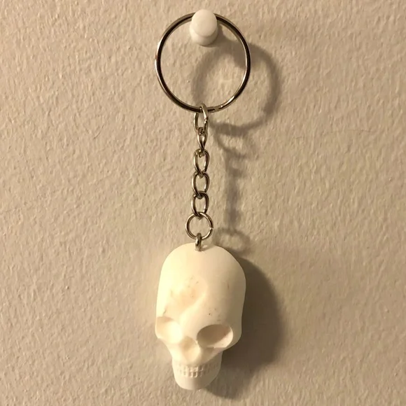Adorable white spooky skull keychain accessory. Handmade from 100% recycled HDPE plastic. Lightweight and durable.