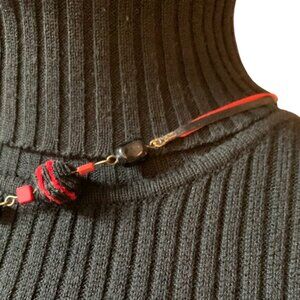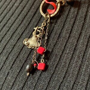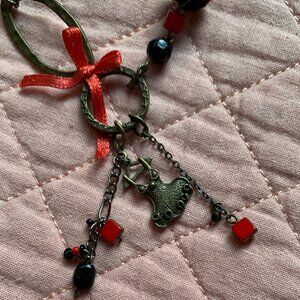 Unique handmade statement necklace featuring an asymmetrical mix of charms, beads, and textured elements in bold red and black tones. Designed with a creative combination of satin ribbon, antique-finish metal rings, and a striped fabric bead, this piece also showcases dangling charms—including a small dress-shaped charm and red cube beads—for a playful, artistic look. Eye-catching and one-of-a-kind.