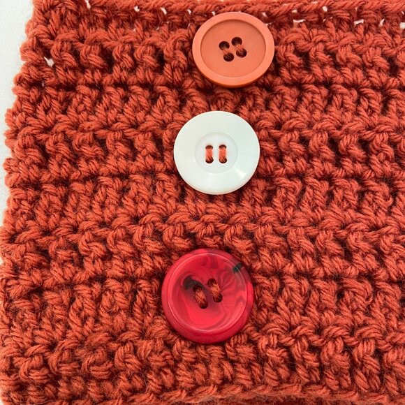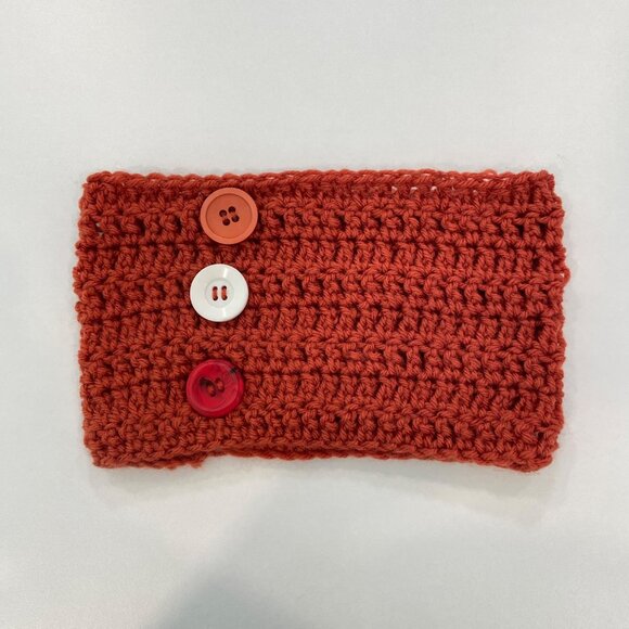handmade knit headband, crochet style ear warmer, red orange knit neck warmer, button accent knit headband, handmade ear wrap, cozy knit winter accessory, rustic knit hair wrap, artisan handmade knitwear, decorative button headband, soft acrylic knit accessory, boho chic winter fashion, farmhouse style knitwear, cottagecore knit headband, coquette cold weather accessory, granola girl knitwear, warm handmade head wrap, fall winter knit headband, compact knit neck warmer, handmade holiday gift accessory, knit headband, red warmer, neck warmer, button headband, winter accessory, handmade gift, crochet headband, soft knit, cozy knit, red accessory, head wrap, button warmer, versatile knit