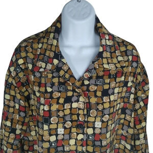 Fabulous brown tones on black background handmade blouse. Real retro vintage look. 70s groove! Button down. Collated. 3/4 length sleeves. Side slits at hips.