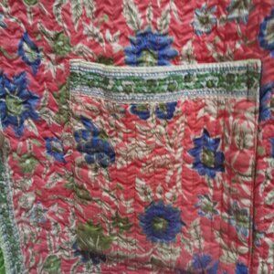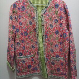 Handmade reversible jacket; pink floral on one side and green gingham on the other. Pockets on both sides. In great condition except that some of the elastic button clasps are stretched out. Could fit a small or medium.