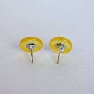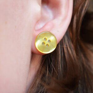 An adorable pair of yellow button stud earrings featuring a shining, glimmering effect. Handmade from upcycled buttons and hypoallergenic stud posts, these are the perfect little accessory to add to your collection. Lightweight and perfect for all-day wear.